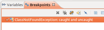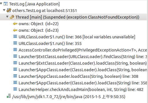解决办法是先把breakpoint里面的ClassNotFoundException: caught and uncaught去掉了。不知道为什么会造成这个结果。