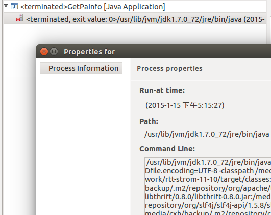 - 从eclipse中copy执行命令。去调试页面,查看刚才执行的command的属性页面。会看到如下界面,copy命令到shell中执行即可。