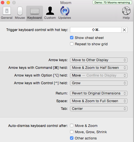 mac下没有找到对应的系统快捷键,虽然可以设定一个zoom键来完成窗口最适化,但是没有快捷键来完成窗口的移动。这里我们通过Moom实现。
